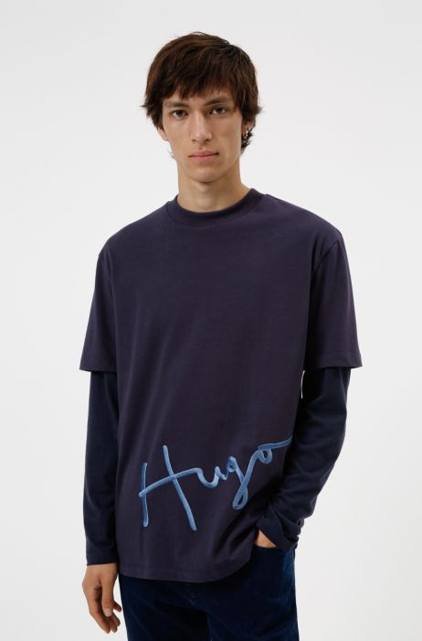 Hugo Cotton Jersey T Shirt With Oversize Handwritten Logo Embroidery